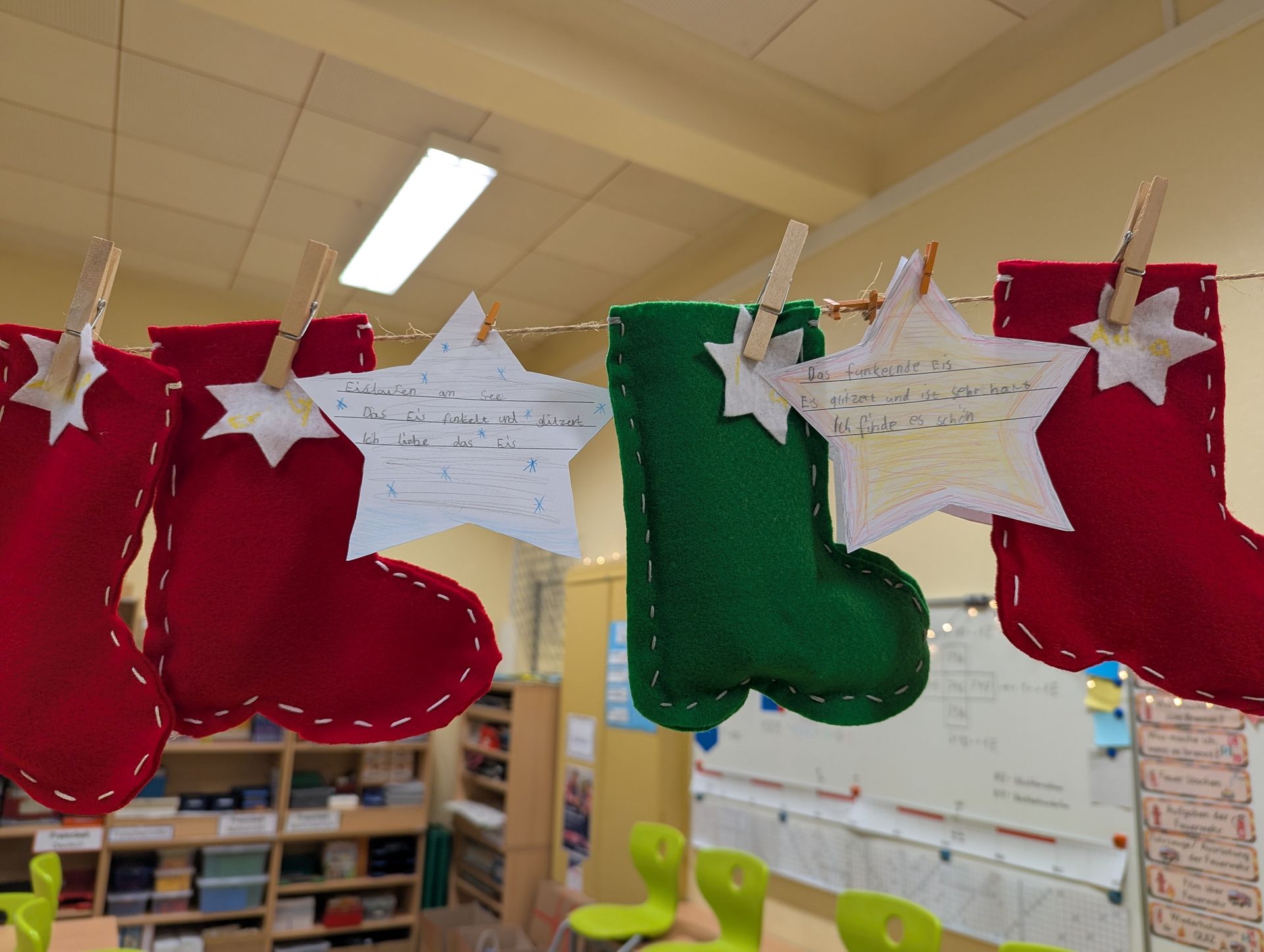Am 6. Dezember haben ein paar Kinder dem Nikolaus ein Gedicht vorgetragen und am letzten Tag vor den Ferien wurden wir sogar noch mit neuen Büchern für unsere Klassenbibliothek überrascht. Natürlich haben wir auch alle wieder zusammen einen schönen Weihnachtsgottesdient gefeiert.