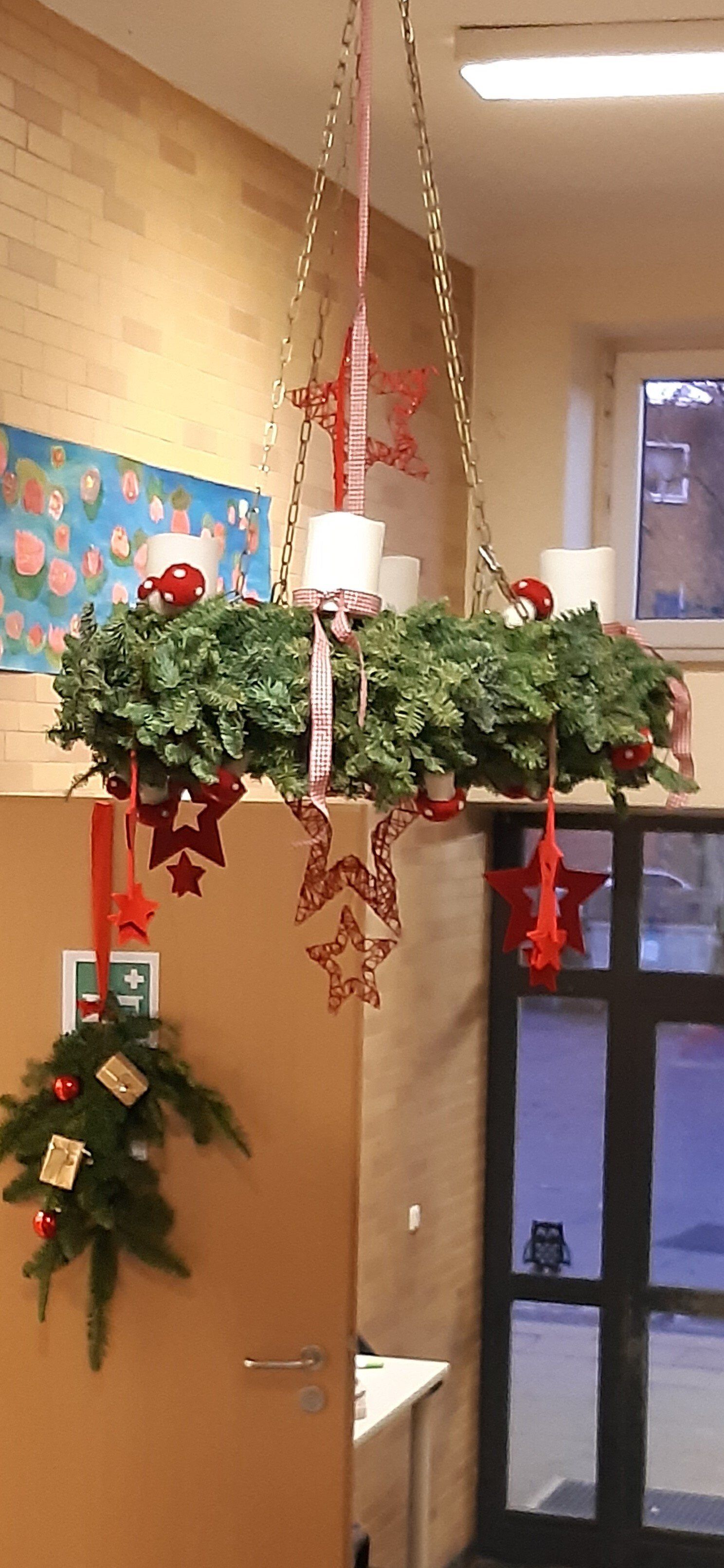 Herzliche bedanken möchten wir uns auch bei Frau Coslar, die wie jedem Jahr unseren großen Adventskranz gebunden und geschmückt hat, der in unserem Flur hängt! Auch wenn wir in diesem Jahr wieder nicht unser Adventssingen montagmorgens unter dem Kranz durchführen können, begrüßt er uns jeden Morgen.