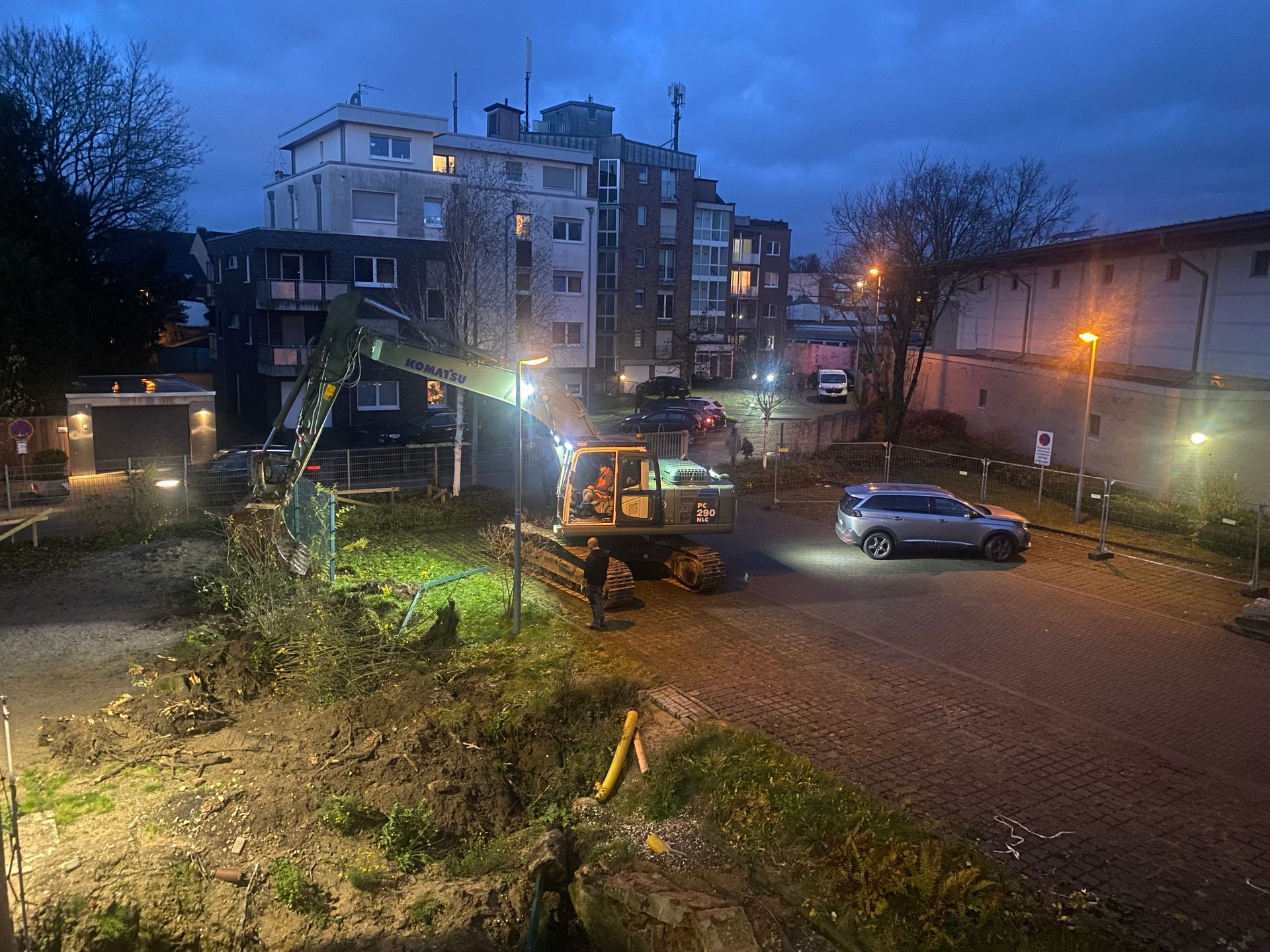 Nachdem Anfang der Woche der Bauzaun erweitert, der Lehrerparkplatz gesperrt und die ersten Container aufgestellt wurde, kam heute ein Bautrupp mit Bagger und die ersten Arbeiten wurden durchgeführt.